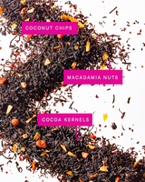 Tea (89%), macadamia nuts (macadamia sugar), cocoa kernels, coconut chips.